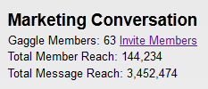 As it goes now, I have 63 folks in my Gaggle, including me. Even now, with so few, this surely amplifies like crazy. My total member reach is up to 144,234 followers and the total message reach is up to 3,452,474! It’s sort of like compound interest: I don’t really know what it is but compound interest has made quite a few savers millionaires over the years (it’s always the way time-travelers and vampires become billionaires, isn’t it?)