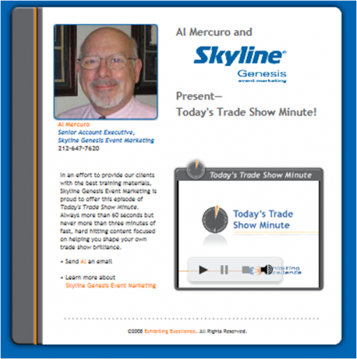 Here’s where I ran across this: Glenn Diehl, owner of the New York distributor of Skyline Exhibits, has a team of eight sales people selling custom trade show exhibits and portable displays to marketers and trade show managers in New York City and several northern counties. Glenn came up with a program whereby his reps can send to their contact lists emails embedded with a link to an informative video, created by Mike Mraz, a trade show marketing expert with a creative knack for video production.
