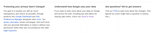 I mean, I want to read the new privacy policy, but I don’t want to spend my day doing it. When I clicked through on the e-mail, I was faced with a Web page that had some material on it, but at the bottom, several different paths to take: