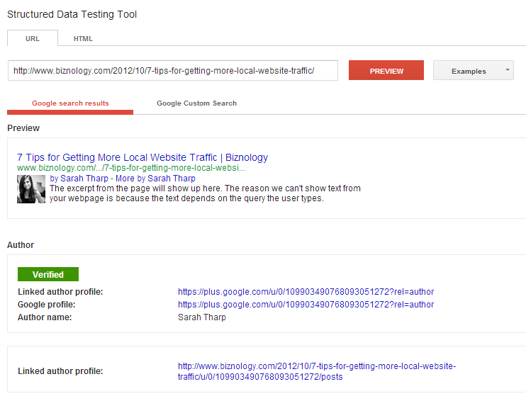 After you arrive at the Rich Snippets Testing Tool page, paste the URL of your blog post and click the preview button. A successful validation means that Google returned an example of your Author Rich Snippet.