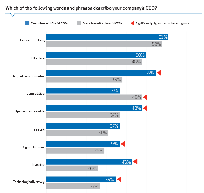 66% of C suite executives say it risky to have an unsocial CEO, versus the 49% who says its risky to have a Social CEO. Today, 42% of CEO are social; this is expected to increase by 50% within 5 years.
