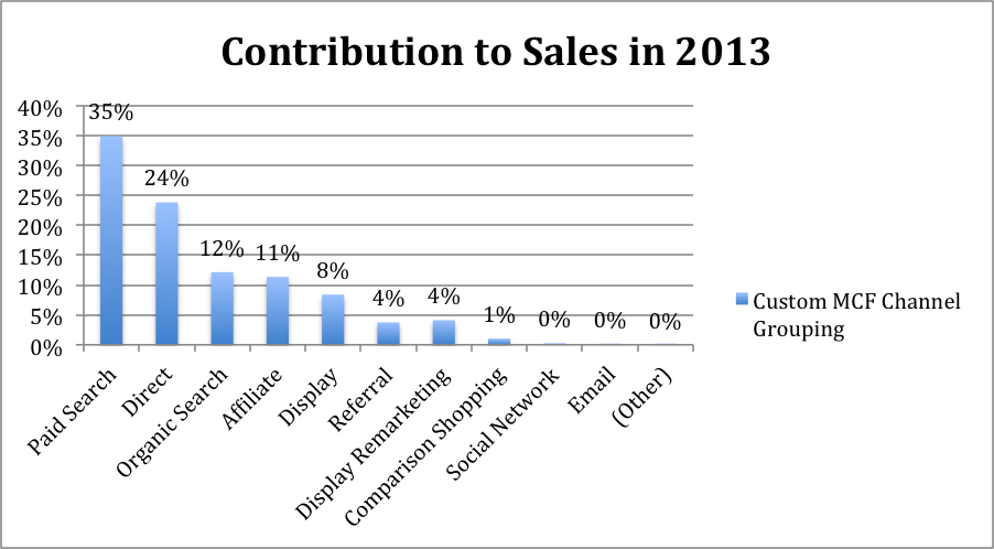 The above chart uses multi-channel funnels in Google Analytics. It measures the total contribution for each of the primary sales channels by looking at both “assists” and “last-touch” conversions. So what does that mean?