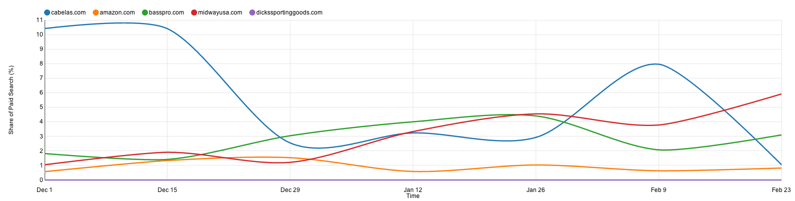 Now we really get a sense of the full search landscape in this category. While Cabela’s appears to dominate total search, this data suggests their presence is superior in organic search and seemingly sporadic at best over the last two months in paid search. Meanwhile, MidwayUSA appears to be increasing their paid search presence, likely because their organic presence is next to nothing. This would need to be confirmed.