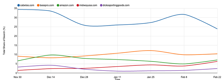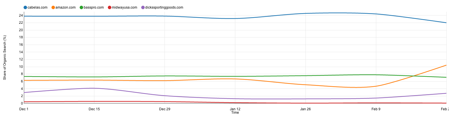 Ah, and then there’s Amazon. They seem to be making strong gains in organic search in terms of hunting equipment, besting everyone but Cabela’s in Feb. If I were working at Bass Pro or Cabela’s, I’d keep a close eye on this trend in particular and try to confirm whether or not Amazon’s share of organic voice has in fact almost doubled in recent weeks.