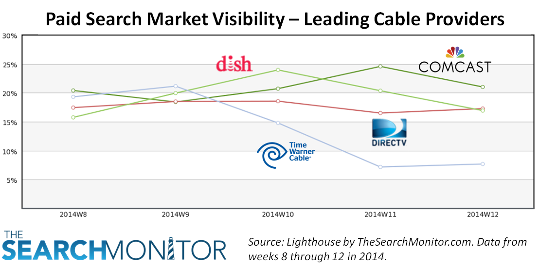 - In March, TimeWarner Cable’s market visibility took a pronounced dip into the single digits where it remained through mid-March. Did TWC shift spend into another channel? Are they saving up ad spend for a big Spring promotion?