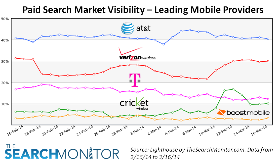 - OK, a bit different than the more monopolistic world of cable! In the world of PPC from mid-February to mid-March, it’s pretty clear that AT&T was dominating market visibility with a 40% score. And talk about consistency in defending that number.