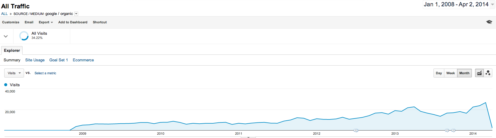 Apart from large campaign-specific content initiatives, most brand publishing will be on a much smaller scale – updates to product copy, derivative blog posts from an ebook, whitepapers to accompany email promotions, etc. What does the impact of these initiatives look like in real life? In my experience with organic search, gradual gains can be expected over time: