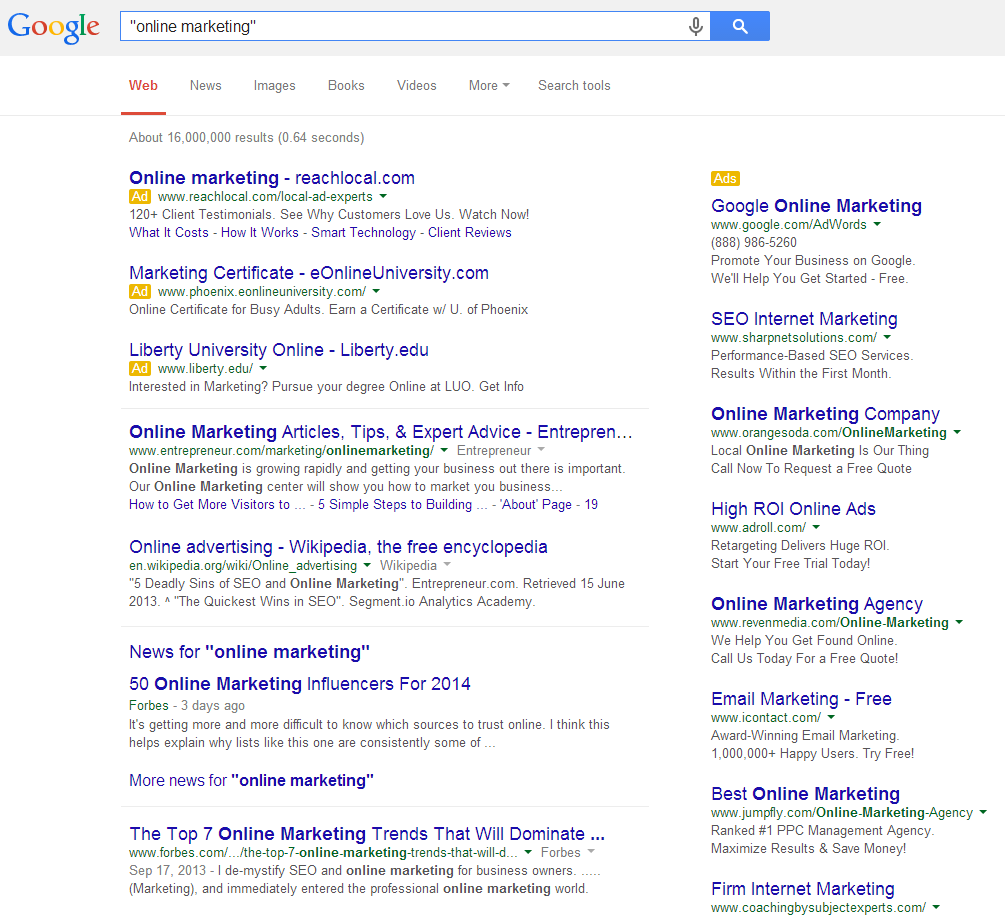 - “query” – Quotation marks tell Google that you are looking for search results containing the exact word/words located within the quotes. For example: