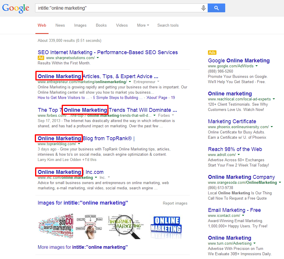 - intitle:query – An “intitle” search is similar to an “inurl” search, but instead will return results that have your queried word in the title (again, we can use quotation marks). For example: