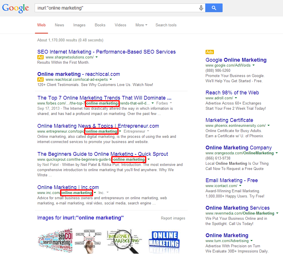- inurl:query – Using “inurl” within your search will provide you with results that possess your search term in their URL (we can use quotation marks to get exact match results). For example: