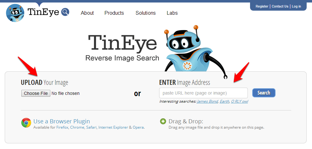 With TinEye you have two options for conducting your reverse image search – upload an image from your computer or paste the image’s URL.