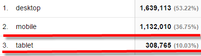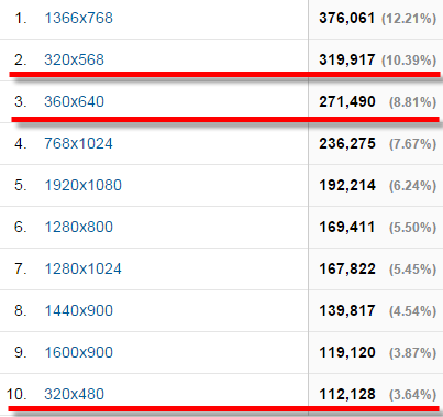320×568, 360×640, 320×480 pixels? Folks aren’t buying as many tablets and the iPhone 6+ and Galaxy Note 4 are not yet ubiquitous. Even the most generous tablet screen isn’t perfect for PC-optimized websites. In my example, there are still quite a few visitors who are coming in via very generous desktop and laptop screen. Here’s a better example, showing that over 45% of all the visitors to this very popular website are visiting via mobile devices, be it phone or tablet: