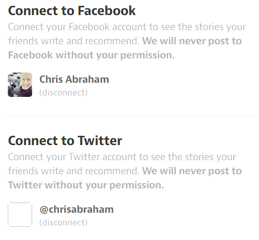 Medium is very cool right now. It’s the next Tumblr, minus the porn. When you join Medium, you have the opportunity to link up your Facebook and Twitter accounts. The benefit of jumping in is that you presumably have spent the last decade building up your Facebook and Twitter reputation and you’ll be able to very quickly leverage your personal brand popularity immediately on Medium.