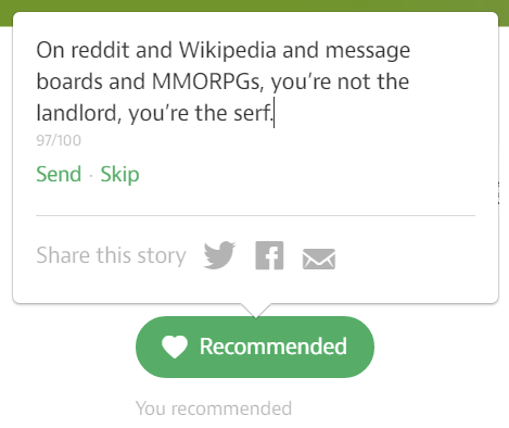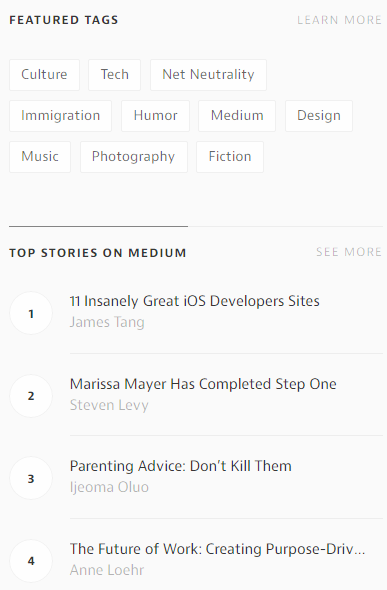 If your article is popular enough, through some hearty mixture of recommendations and visits and reads, then you’ll get the attention of Medium editors and you can be looped and grouped into a publication or into a tag association (can you define tags when you write the article? I have yet to discover if tagging your post is a feature in Medium the way it is in Drupal, Blogger, WordPress, TypePad, etc) that can then rekindle or accelerate interest in your article.