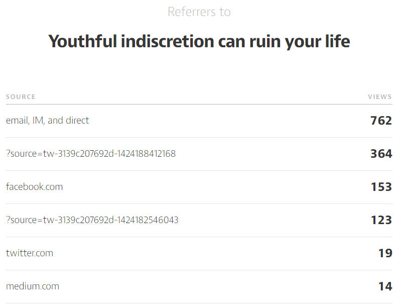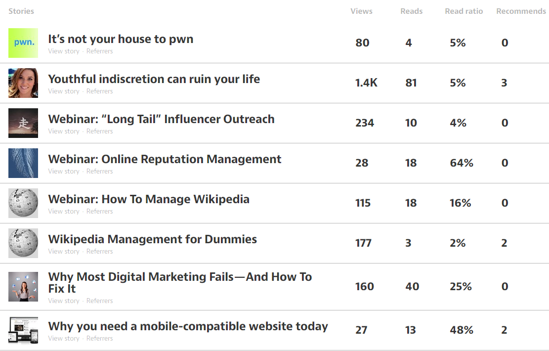 Once all is said and done, I really don’t get much feedback at Biznology or anywhere else. I never know how many people read my stuff, how excited people are, how much I am tapping the zeitgeist. I get a little bit better insight from Medium. They stats tell me how many views my articles have received, how many reads, the read ratio (viewers to readers — how many people have bounced before getting to the end of my posts), and also how many Favorites I have received. I also get my referrals. I get to see from whence my reads came. Here’s a smattering of Stats you can look at from my Medium: