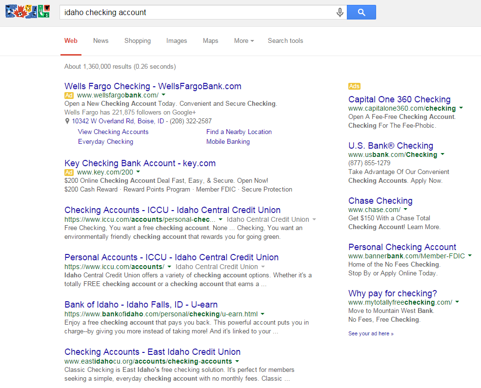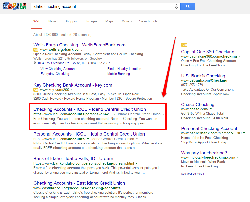 Here are the results for “Idaho checking account” in the Boise locality, a query relevant to ICCU: