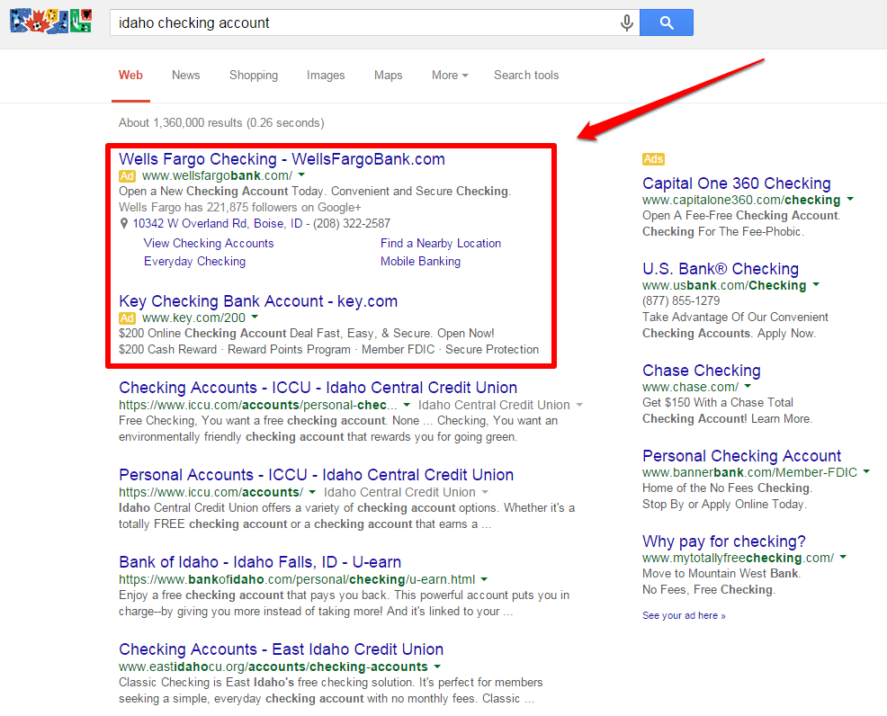 As you can see, ICCU did not win the PPC battle as Wells Fargo and Key Bank are likely investing a fair amount to show up in the paid section.