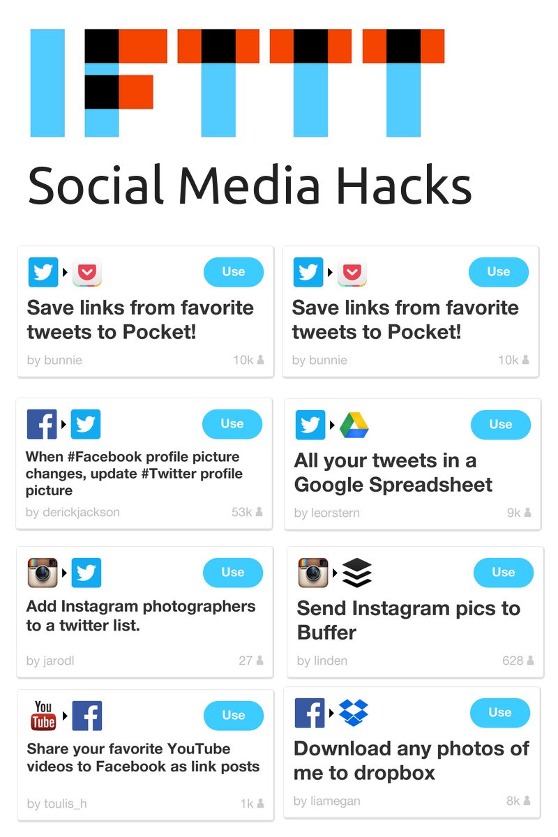 IFTTT can stalk your phone, your behavior on Twitter, Instagram, Bitly, Blogger, Buffer, Delicious, Facebook, Facebook Pages, Feedly, Fitbit, Flickr, Foursquare, your iOS or Android GPS location, LinkedIn, Pocket, Reddit, SoundCloud, Tumblr, Twitter, Withings, and even Yo (and so many more, I just cherry-picked). Then, you can make IFTTT do any number of cool things such as changing your profile picture on Twitter every time you change it on Facebook, automatically share all of your Instagram photos as Twitter-native images rather than just a link to Instagram, and all sorts of pre-packaged and pre-baked recipes you can go explore right now over on the Recipes to Streamline Your Social Media section of IFTTT — check it out but be sure to come back!