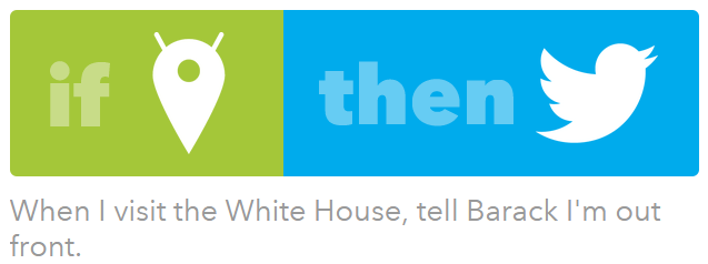 It’s thrilling! While I have yet to do these sorts of small, flirty, things yet, I could presumably tweet @bobfine every time I pass by UberOffices on my motorcycle. I did that with a pre-baked recipe to tweet president Obama whenever I am near the White House. IFTTT can connect to my Android (or your iPhone), keep track of my GPS, and then, when I reach a perimeter of my choosing, as tight or as loose as I want to the White House, then my Android will alert IFTTT and a tweet will be sent.