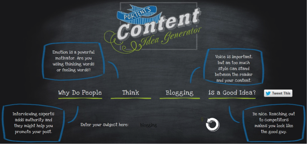 Portent is a fun site that helps you hash out an idea or a title for a blog by just entering a keyword or key phrase into the free online tool. To give you a better idea how it works to fuel your creative writing juices, I entered the word “blogging”. Here is what I got: