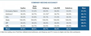 So we invited vendors of B2B prospecting data to participate, and we structured a research study to get at the accuracy of a statistically projectable sample of company records from the vendors. The five participants who agreed and contributed a data sample, are Equifax, Harte Hanks, Infogroup, Lake B2B, and Salesforce. Our sincere thanks to them all. (Harte Hanks has since sold its prospecting data business.)
