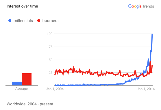 A quick comparison in Google Trends between the words “boomers” and “millennials” seems to closely reflect our obsession with the generation born after 1980: