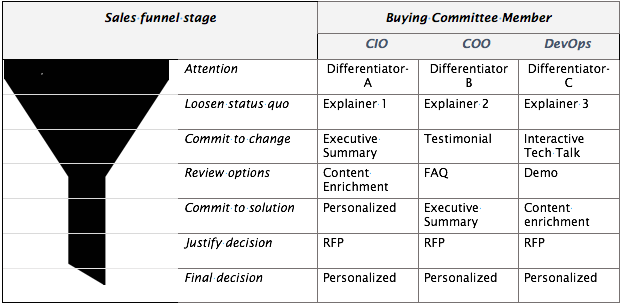 The table below is adapted from an excellent article, What’s a Successful ABM Strategy Without Killer Content?, by content marketing consultant Rebecca Smith of Heinz Marketing. It’s designed to put help marketers develop a content strategy for account-based marketing. I’ve adapted this model to show how different kinds of tactical video might serve to advance the kind of buyer’s journey typically encountered in technology businesses.