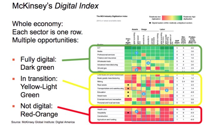 This McKinsey table shows the whole economy in one quick view. Every row is a sector of the economy. Most of the economy is not digital (red and orange) or it is in transition (yellow and light green). Here’s some of what could use easy entry to this new digital Earth: