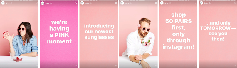 Many consumer brands are making good use of Instagram stories, and unlike NASA, they will often feature a traditional call-to-action, like J. Crew did when it was selling sunglasses. Marketers have been blasting out the “LIMITED TIME ONLY” message since the first caveman started selling round rocks. Weaving together a visually rich story that goes away in 24 hours and ending it with a CTA is the perfect tool for any kind of time-limited offering. And, we know that few things motivate buyers as much as the door slamming shut on a great deal for a desirable product or service.
