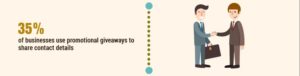 35% of businesses use promotional giveaways to share contact details. This means they can replace business cards. Since promotional products are kept around for long periods of time (studies show that many are kept for at least a year, sometimes up to three years), they are a better calling card than a plain old business card. Business cards are not kept and used like promotional products are; therefore, they don’t have the same power to help a recipient recall your business name or brand.