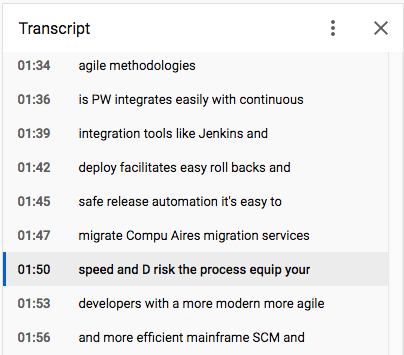 For those who do not know, YouTube automatically provides a full “transcript” for nearly every video on the platform. Just click on the three dots at the bottom right of the video and select “Open transcript” to pop up a time-coded listing of all captions. Clicking on a caption will move the video playback to that point in the time code.