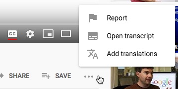 Clicking dots at the lower right of the video screen provides access YouTube’s automatic “transcript” (a listing of captions).