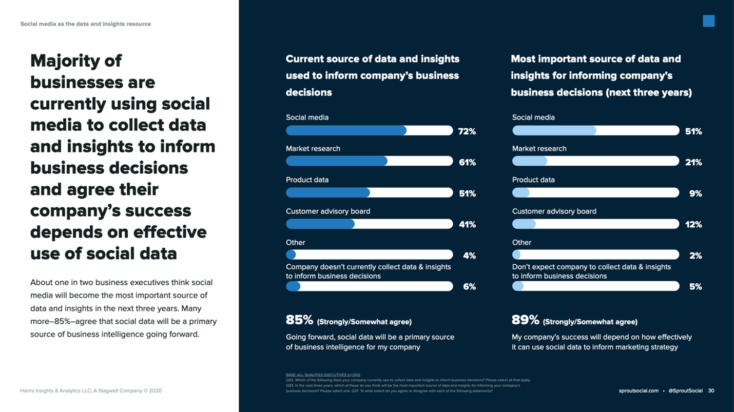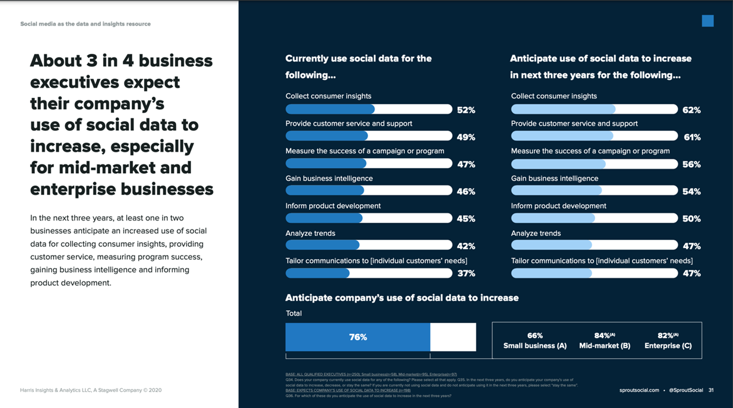 Last week, a post from social media management platform Sprout Social made me stop dead in my scrolling tracks. The post promoted new research that showed executives expect an increase in their companies’ use of social media data, and – much more notably – in the number of departments throughout the company leveraging social media data.
