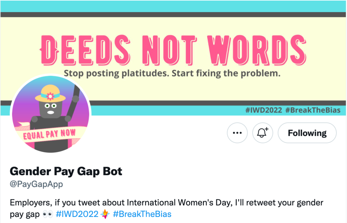 On International Women’s Day the Gender Pay Gap Bot, which has more than 250k followers, tracked the gender pay gap for UK companies—and US companies doing work in the UK—that tweeted in celebration of International Women’s Day. Hundreds of companies were outed for their performative marketing and lack of pay equity. Many companies panicked and removed their “Go Women Go” tweets, but the deleted tweets were captured in a new Twitter feed that had nearly 28k likes and more than 10K retweets.