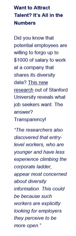 human capital data transparency. Why? Because investors are finally linking inclusive cultures to better business outcomes. State Street Global Advisors CEO, Cyrus Taraporevala, said it best during a recent interview, “The specific tactics may vary, but investing in the workforce – which is a lot more than just compensation, it’s about helping people think about their careers, it’s about advancing their careers, it’s about mobility, it’s about the culture of the organization to attract, retain, and motivate a great workforce – that’s always been a huge competitive advantage for some companies.”