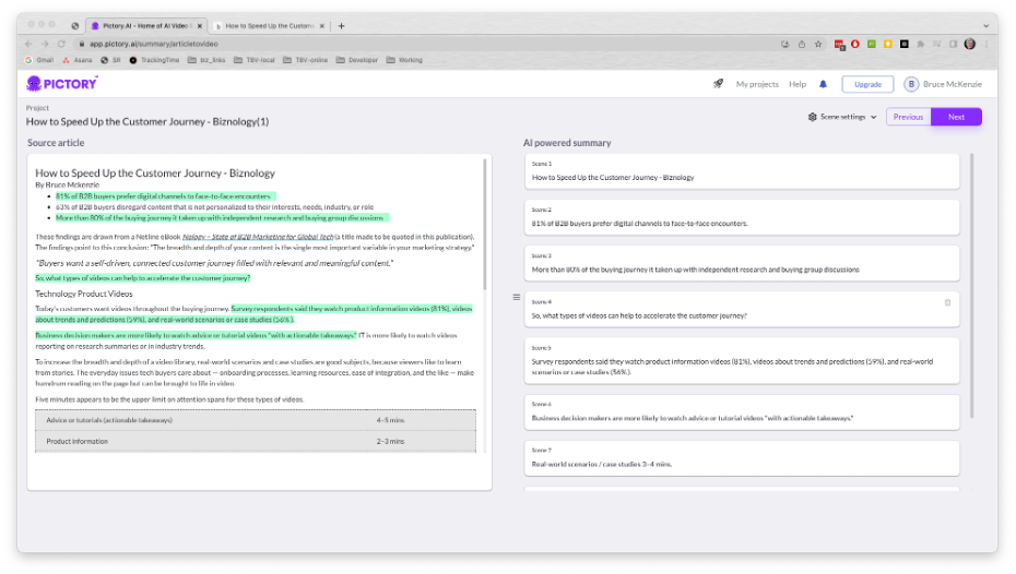 The AI started out by highlighting the key points in the text. I don’t think that any human reader would have a made the same selections. But Pictory’s interface is so simple and user-friendly that It only took a few minutes to edit the AI’s work to reflect the ideas that I thought would appeal to the viewer of the video.