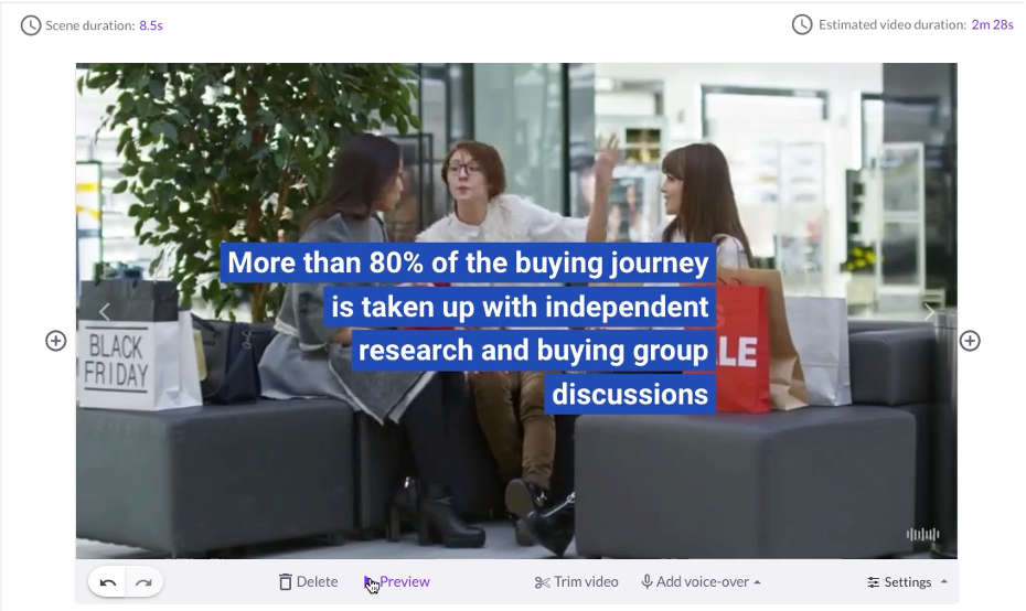 The AI’s video selection here was off the mark, but fun. Its weak grasp of its subject at this point was quite obvious, but oddly endearing. For example, the scene in the video where the buying team shops for a technology upgrade at a mall’s Black Friday sale made me laugh. These tech decision-makers didn’t know about Cyber Monday? But, again, I was impressed by how easy it was to find more appropriate video clips in Pictory’s library.