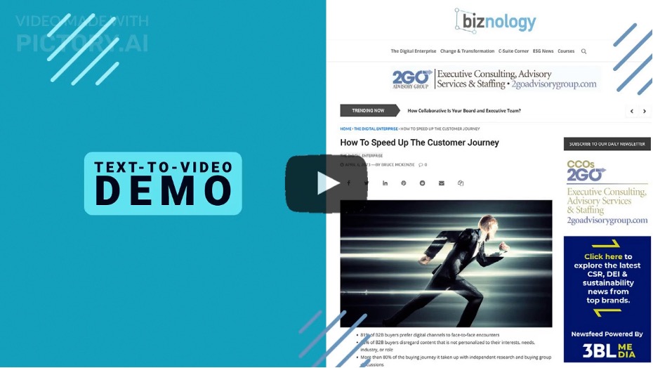 For my experiment, I used the text of my most recent Biznology article, which talks about the content preferences of buying teams who are evaluating software solutions. Like most text, the article was written with no thought given to how it would work as a video. That makes text-to-video a challenge for any form of intelligence.